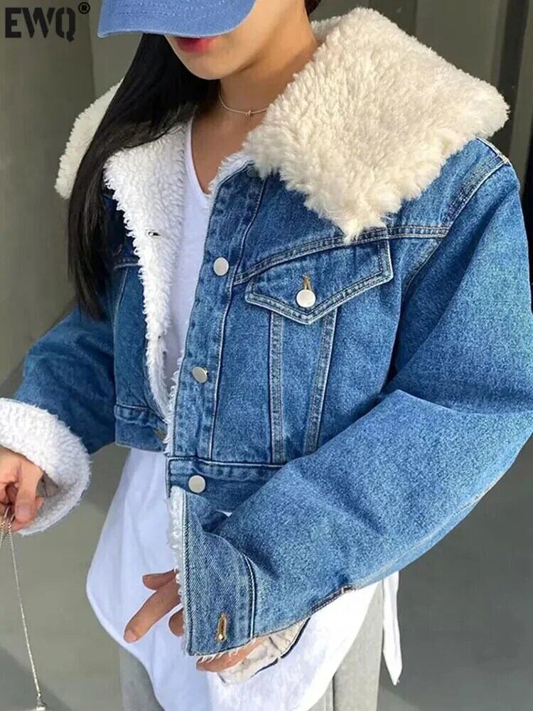 [EWQ] シングルブレスト ラペル コントラストカラー ラムポケット ショート デニム コート ジャケット アウター レディース トップス 秋冬 16U5802 オータム 秋物 ウィンター 冬物