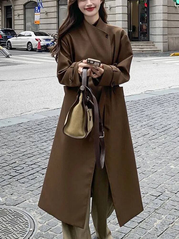 [EWQ] 非対称フラップ気質ドラップコートルーズウエストストラップロングウインドブレーカージャケット秋冬 16U6494 オータム 秋物 ウィンター 冬物