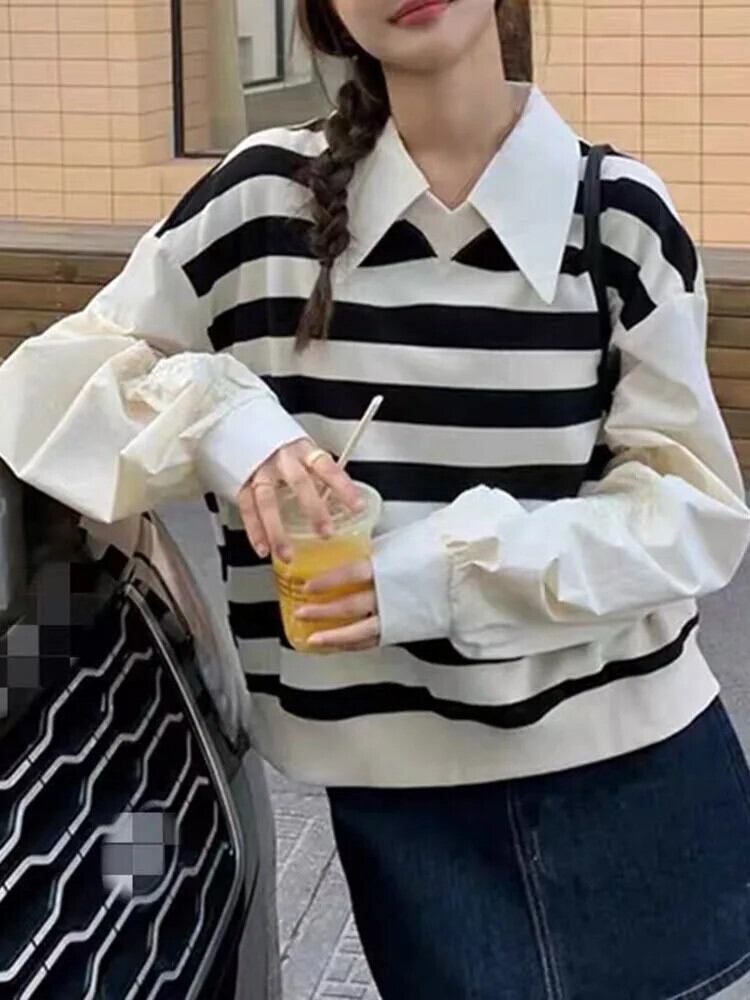[EWQ] 長袖ストライプ ラペル スプライス ブラック ホワイト コントラスト カラー プルオーバー レディース シャツ レイエス トップス ブラウス 16U5528 ロング