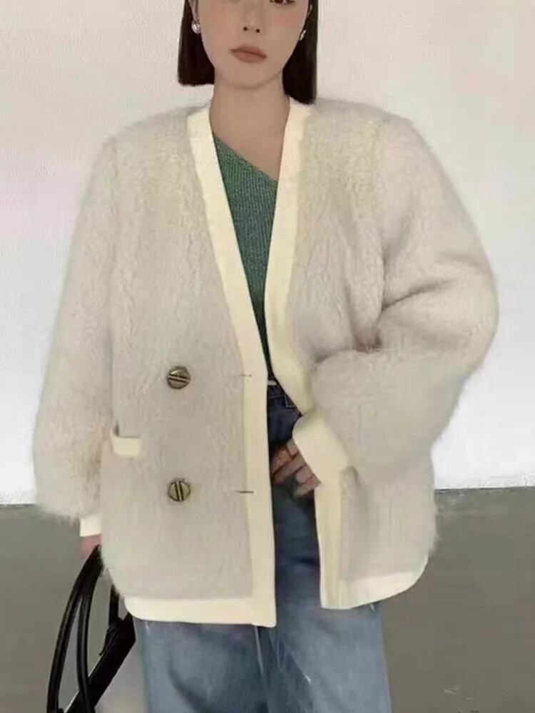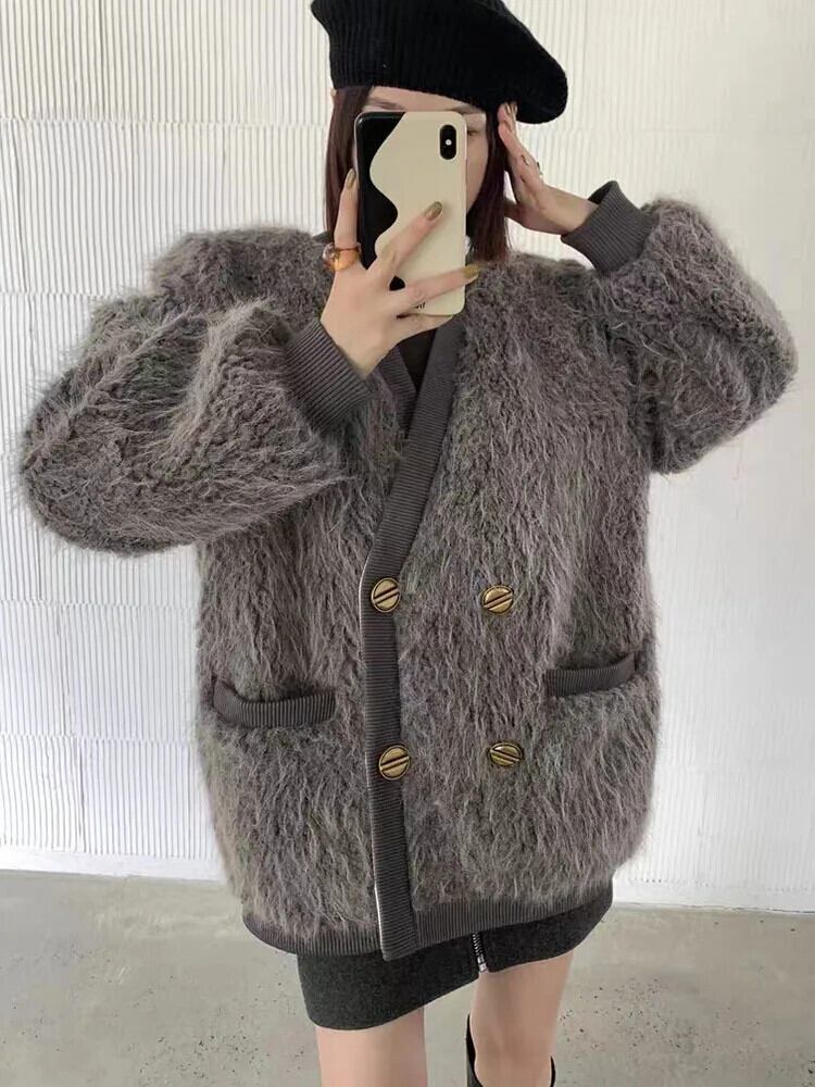 [EWQ] Vネック ダブルブレスト フェイクファーコート レディース 厚手 暖かい ポケット 長袖 レディース アウター 秋冬 6U6491 ロング オータム 秋物 ウィンター 冬物