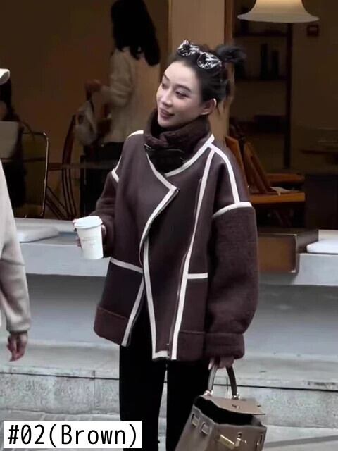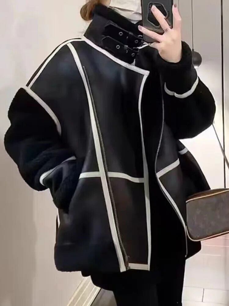 [EWQ] タートルネック コントラストカラー ジッパー オートバイ ボンバー レディース レザー ラムウール ジャケット アウター 秋冬 16U6492 オータム 秋物 ウィンター 冬物