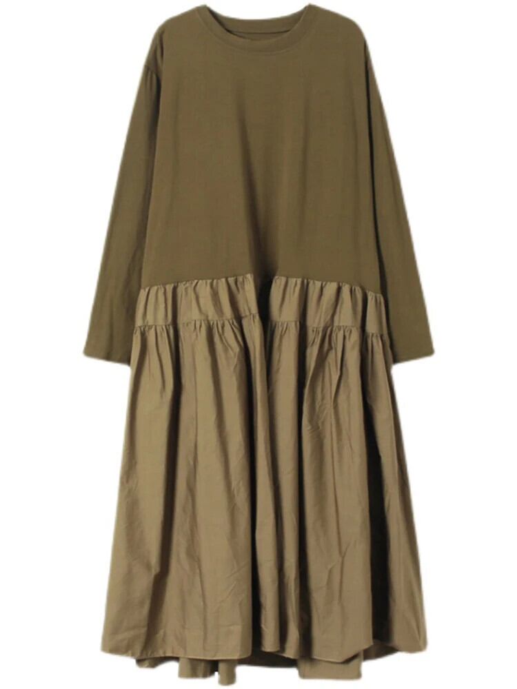 [EWQ] ルーズプリーツパッチワーク T シャツドレス長袖ビッグサイズドレス Vestido 秋冬 6U4325 ロング オータム 秋物 ウィンター 冬物 Tシャツ