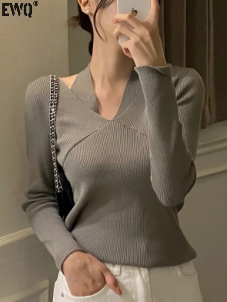[EWQ] ブラック グレー ハンギング ネック アウト オフショルダー スリム 長袖 レディース ニット セーター 秋冬 16U6195 ロング オータム 秋物 ウィンター 冬物