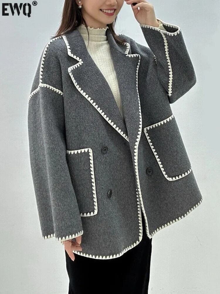 [EWQ] 長袖厚手ブラウンウールコートオーバーコートグリーングレージャケットトレンドソリッドベーシックトップス U6237 ロング ソリッドカラー