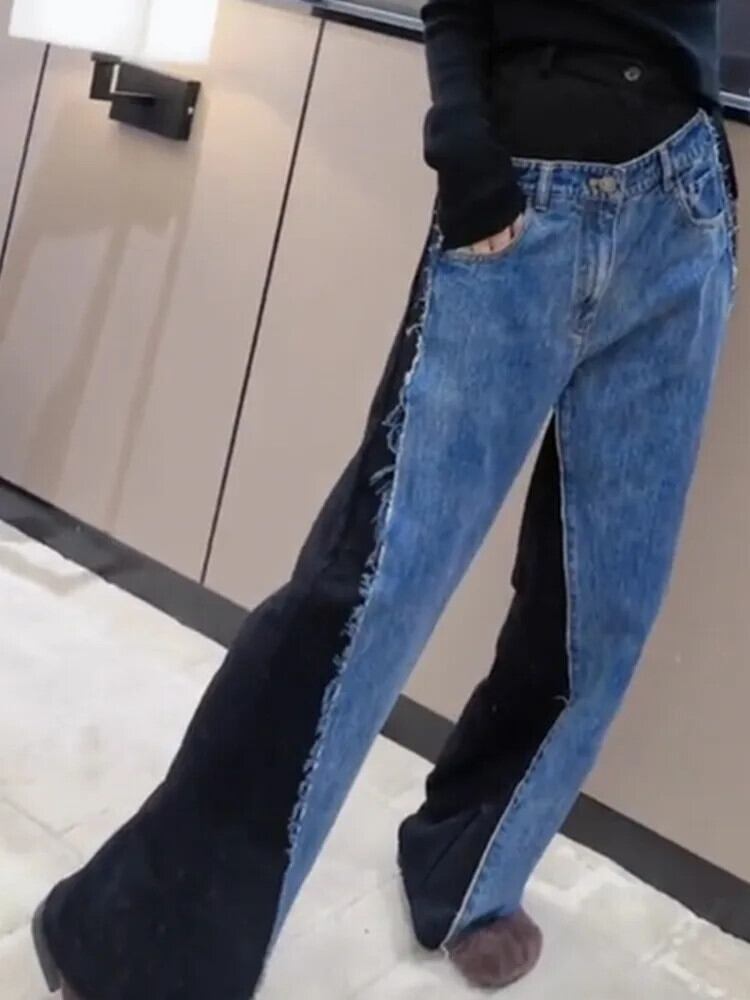 [EWQ] コントラストカラーバリパッチワーク ルーズイレギュラーデニムパンツ ストリート ロングジーンズ 秋 16U5618 オータム 秋物