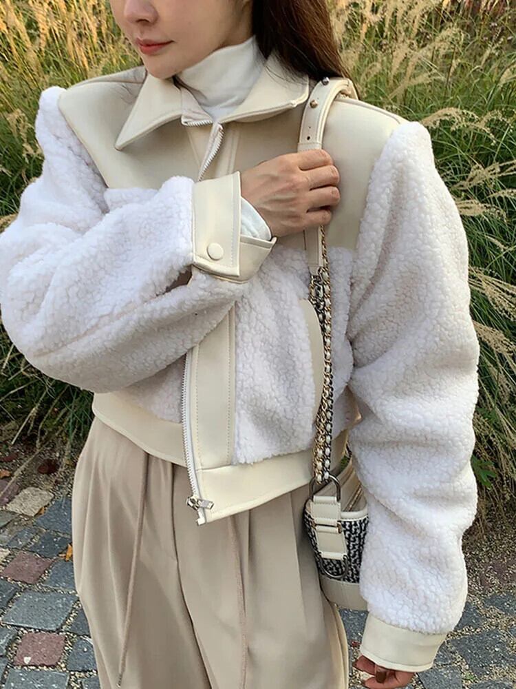 [EWQ]ラペルコントラストカラーパッチワークラムウールステッチジッパージャケット長袖ポケットウォームコート秋冬U6412 ロング オータム 秋物 ウィンター 冬物