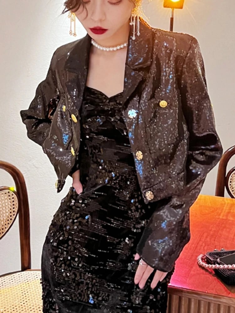 [EWQ] 黒赤スパークリングスパンコールパーティーシングルブレストラペルボタンルーズストリートショートコートトップジャケット U6230 レッド ブラック