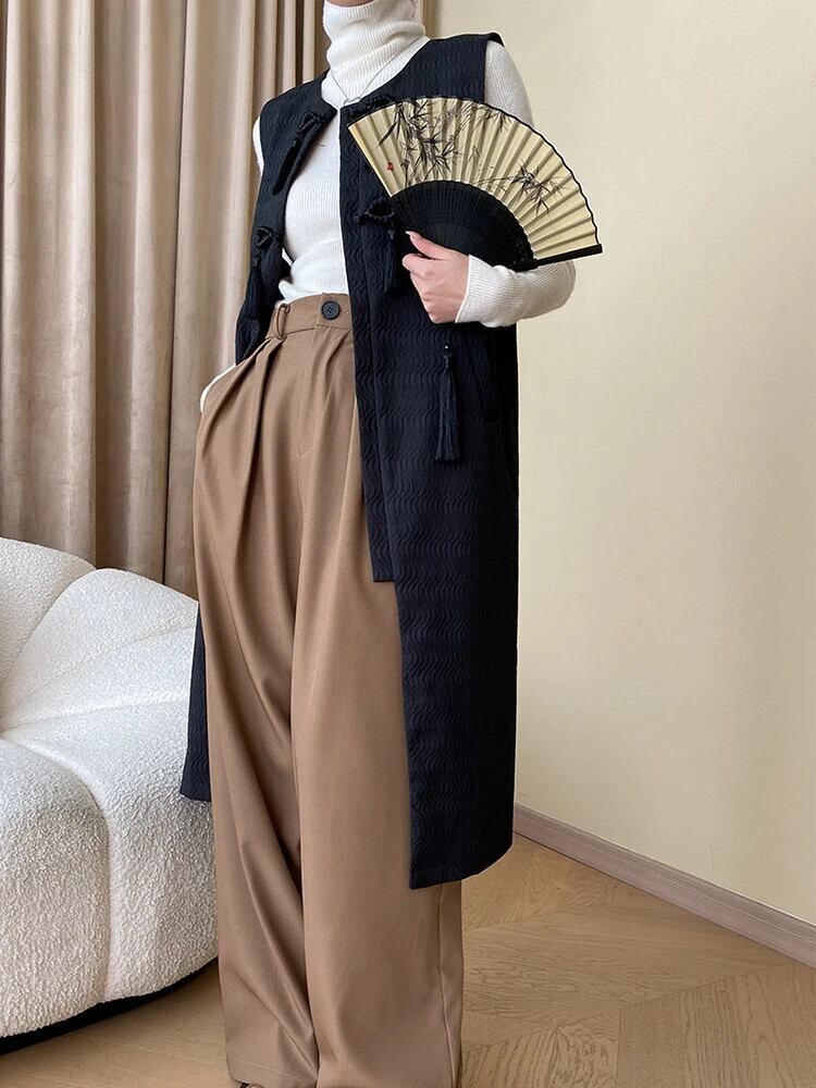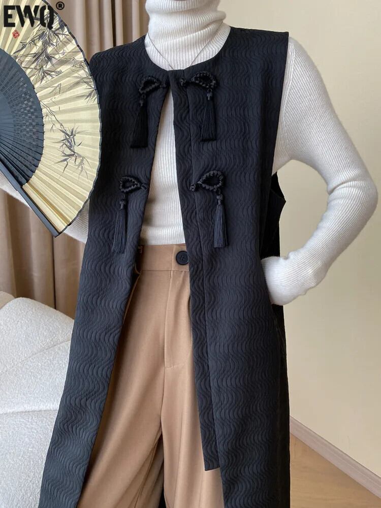 [EWQ] シックリボンボタン黒ベスト O ネックルーズ丈ノースリーブジャケットチョッキ秋冬 16U5129 ブラック オータム 秋物 ウィンター 冬物 Oネック