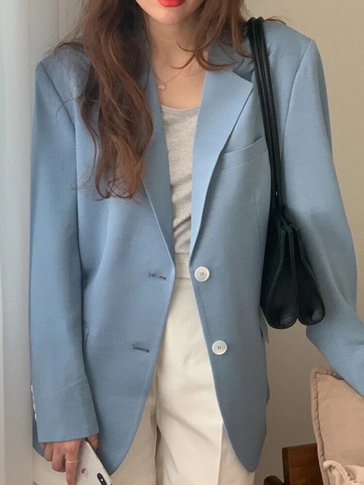 [EWQ] 2 つボタン ルーズ ブレザー コート 長袖 ブルー スーツ ジャケット 秋冬 シック 16U3902 ロング オータム 秋物 ウィンター 冬物