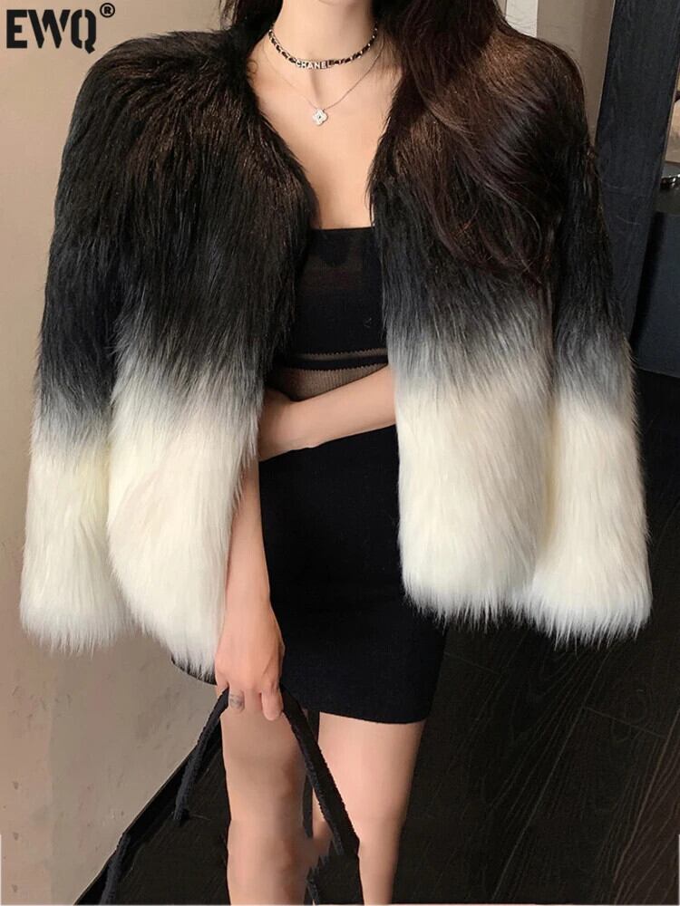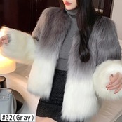 [EWQ] グラデーションフェイクフォックスファーコントラストカラーカーディガンコート長袖アウター冬秋ジャケット U6220 ロング オータム 秋物 ウィンター 冬物