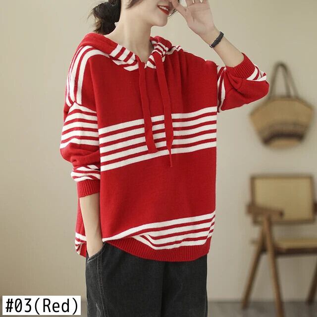 [EWQ] コントラストカラーストライプ巾着フード付きプルオーバーセーター長袖オールマッチ秋冬 6U6296 ロング オータム 秋物 ウィンター 冬物
