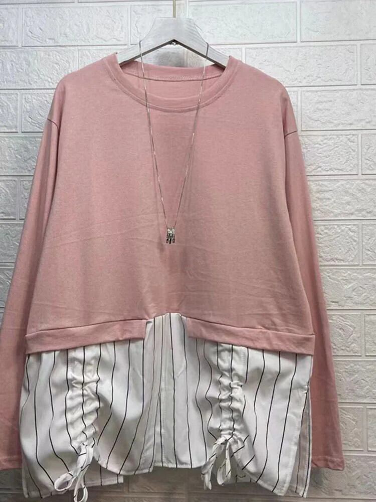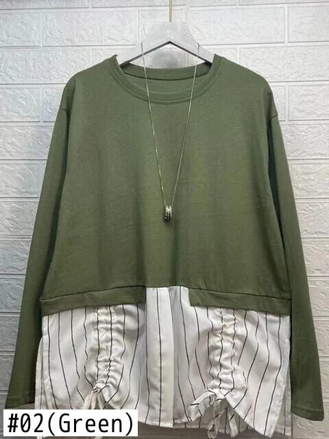 [EWQ] ルーズシャツパッチワークストライプ巾着 O ネック長袖コントラストカラープルオーバートレーナー秋新 U6015 ロング オータム 秋物 Oネック