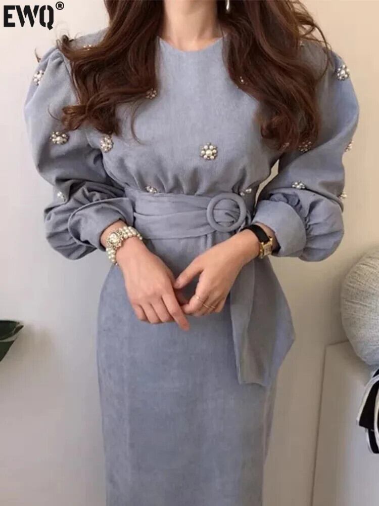 [EWQ] ブラックブルー O ネックビーズウエストベルトスリムロングバブルスリーブラップヒップドレス秋春 16U6352 スプリング 春物 オータム 秋物 ハーネス Oネック