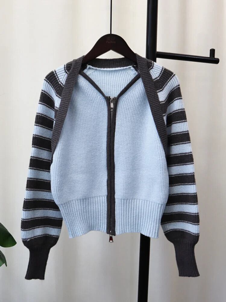[EWQ] ストリートジッパーストライプスプライシング偽二枚カーディガンコートセータートップ秋冬美しい オータム 秋物 ウィンター 冬物