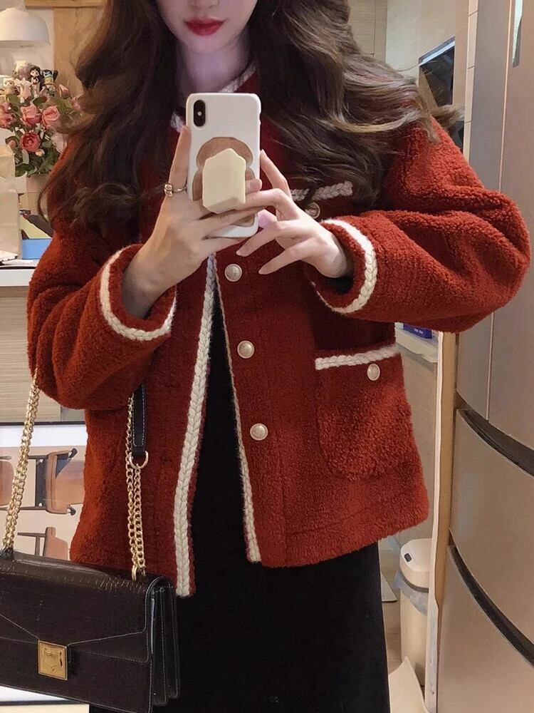 [EWQ] レッド O ネックコントラストカラーシングルブレストポケット厚手コートジャケットレディースショートアウター秋冬 オータム 秋物 ウィンター 冬物 Oネック