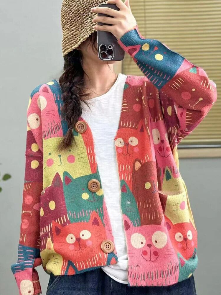 [EWQ] ミンクフリースニットカーディガンシングルブレストプリント漫画セーター長袖レディースコート秋冬 U6432 ロング オータム 秋物 ウィンター 冬物