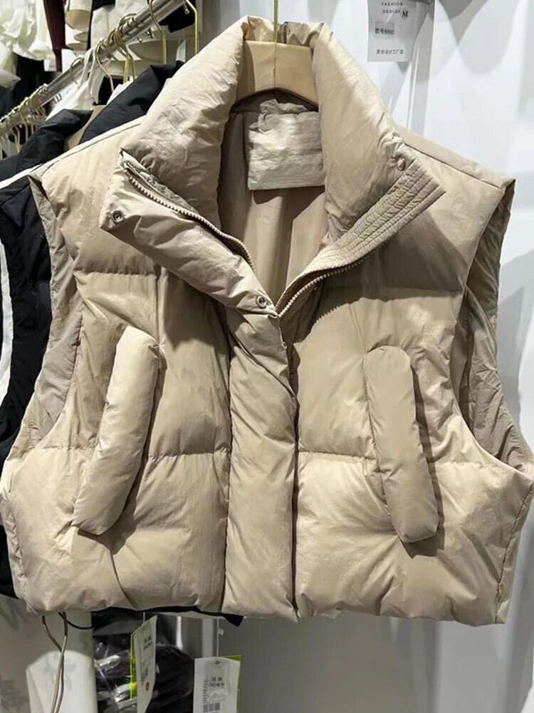 [EWQ] ジッパー ポケット スタンドカラー ノースリーブ 厚みある 暖かい ホワイト ダックダウン レディース ショート タンクトップ ベスト 冬 秋 16U6112 オータム 秋物 ウィンター 冬物