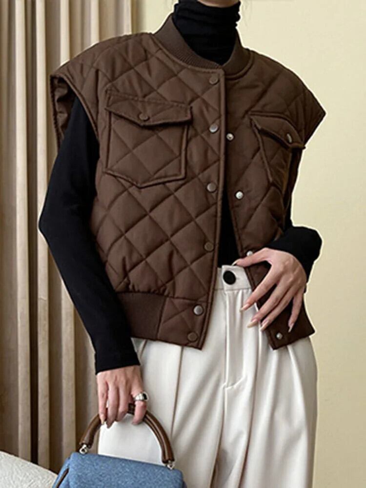 [EWQ] シングルブレスト ポケット ブラック ブラウン スタンドカラー ノースリーブ チェック柄 婦人 ベスト 秋冬 16U5809 オータム 秋物 ウィンター 冬物