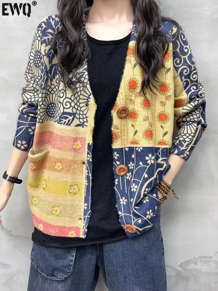 [EWQ] カラフルミンクフリースタイダイカーディガンニットシングルブレストポケット長袖セーター秋冬6U6431 ロング オータム 秋物 ウィンター 冬物