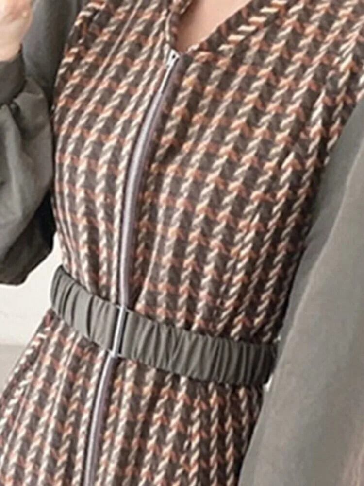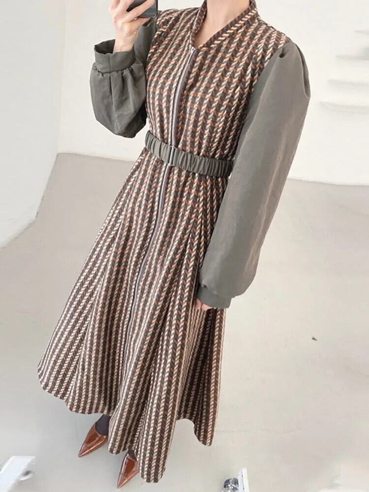 [EWQ] V ネック長袖コントラストカラーチェック柄ジッパーウエストスリムパフィースリーブドレス秋春 16U5854 ロング スプリング 春物 オータム 秋物 Vネック