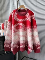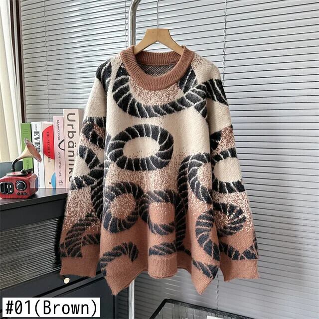 [EWQ] ルーズ コントラスト カラー プリント ニット O ネック プルオーバー トップス ルーズ 長袖 セーター 秋 16U5611 ロング オータム 秋物 Oネック