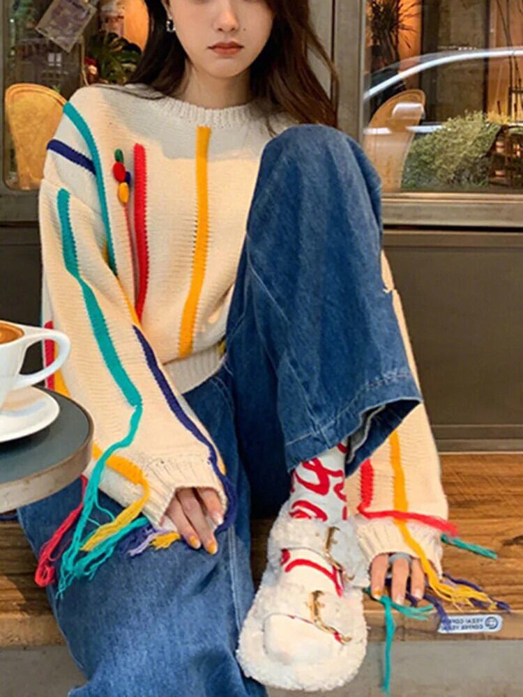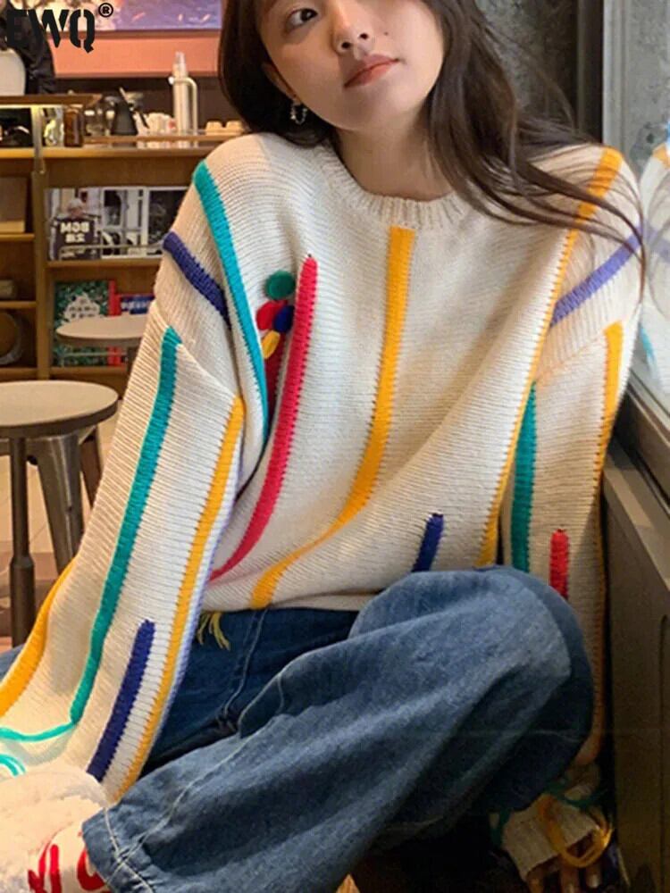 [EWQ] Oネック 長袖 ゆったり カラフル ストライプ テル 厚手 暖かい レディース ニット プルオーバー セーター トップス 秋冬 16U6145 ロング オータム 秋物 ウィンター 冬物
