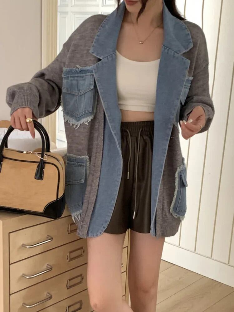 [EWQ] 冬セーターニットコートデニムパッチワークポケットジャケット厚く暖かい秋ビッグサイズトップス 16U4271 オータム 秋物 ウィンター 冬物
