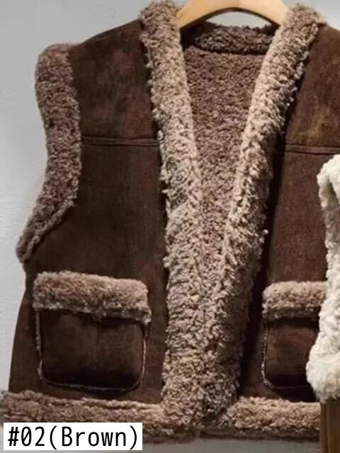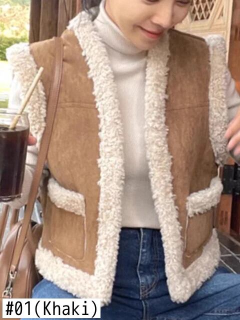 [EWQ] ラムウール ファー ポケット コントラストカラー オールマッチ カーディガン ショートベスト コート ノースリーブ ジャケット アウター 秋冬 6U6318 オータム 秋物 ウィンター 冬物