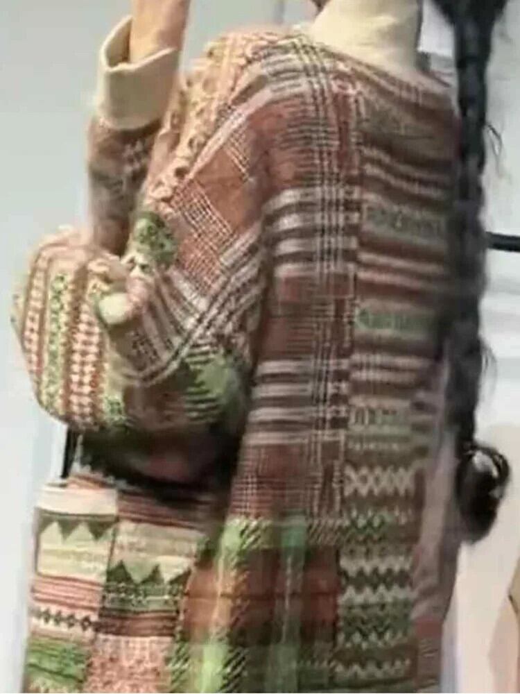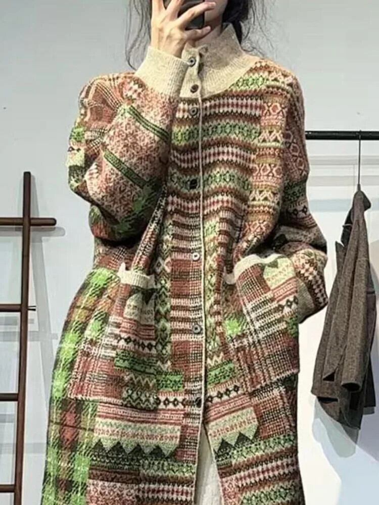 [EWQ] タートルネック シングルブレスト コントラストカラー ポケット 長袖 プリント カーディガン セーター アウター 秋冬 6U6438 ロング オータム 秋物 ウィンター 冬物