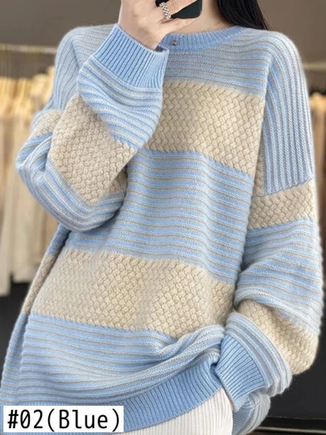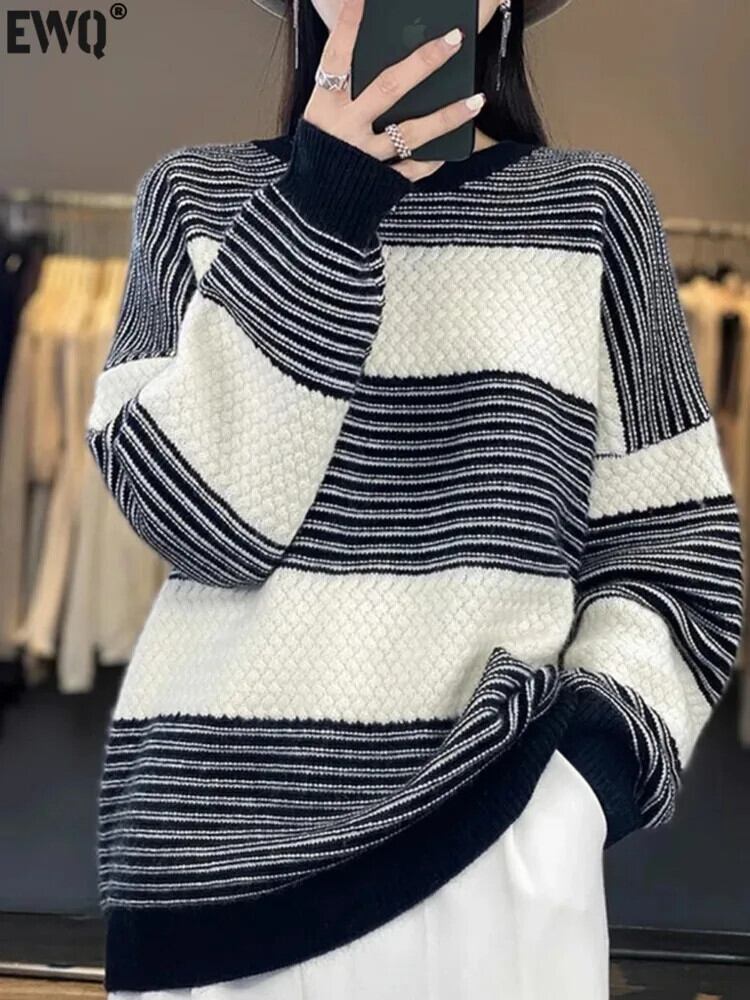 [EWQ] 秋冬 O ネック コントラストカラー ストライプ プルオーバー ウール ニット セーター レディース 長袖 カシミア ジャンパー 16U6479 ロング オータム 秋物 ウィンター 冬物 Oネック