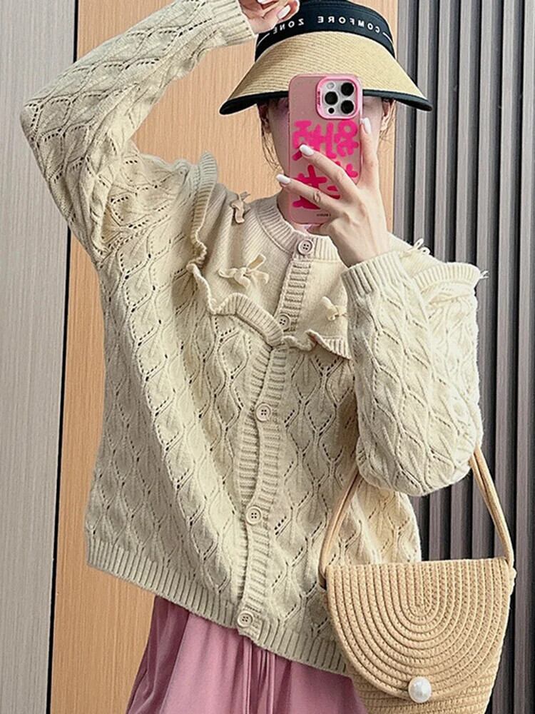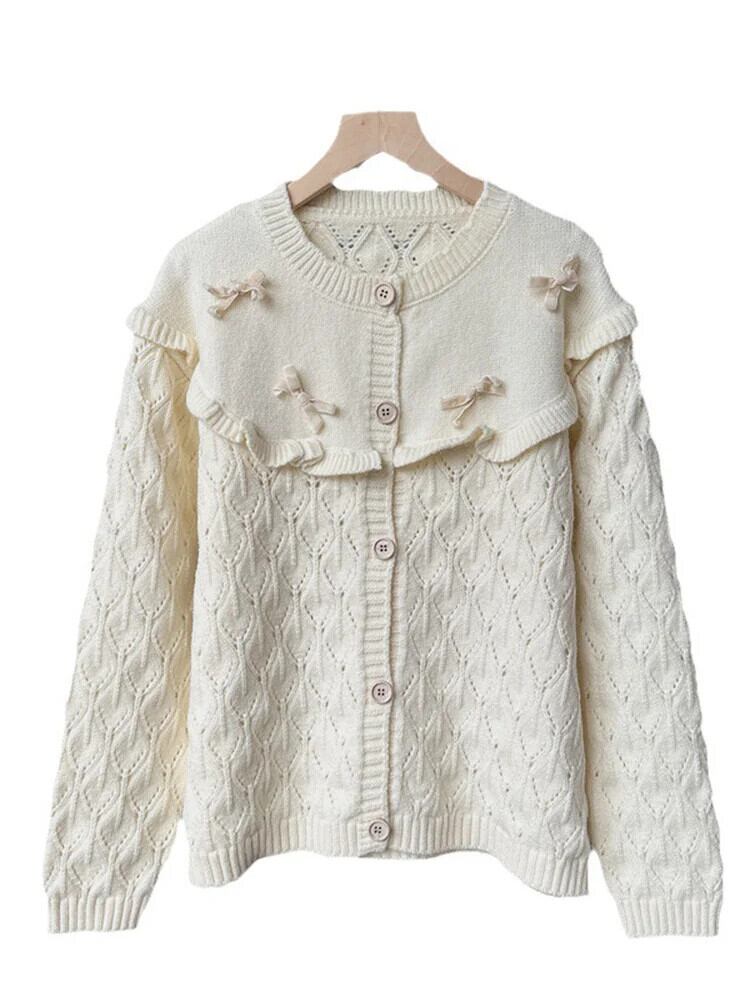 [EWQ] リボン装飾カーディガンコートシングルブレスト無地パッチワークセータージャケット秋潮ニットコート 00 オータム 秋物 ソリッドカラー