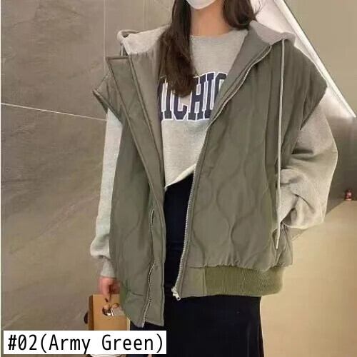 [EWQ] フード付き ジッパー ポケット ノースリーブ キルティング ブラック アーミー グリーン ベスト アウター コート 婦人 秋冬 16U5823 オータム 秋物 ウィンター 冬物