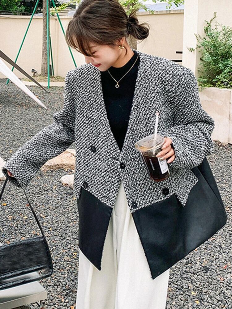 [EWQ] V ネックコントラストカラーダブルブレストスーツウールショートコート長袖ジャケット秋冬 16U6251 ロング オータム 秋物 ウィンター 冬物 Vネック