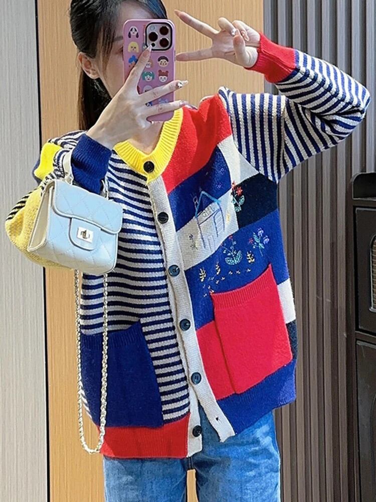 [EWQ] エイブル コントラストカラー ストライプ シングルブレスト ポケット ニット カーディガン セーター レディース 秋冬 6U6472 オータム 秋物 ウィンター 冬物