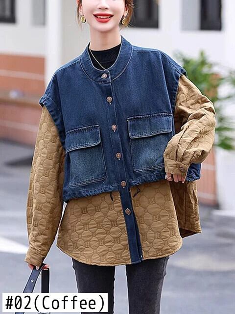 [EWQ] O ネックシングルブレストポケットコントラストパッチワークデニムジャケット長袖コート生き抜く秋春 16U6326 ロング スプリング 春物 オータム 秋物 Oネック