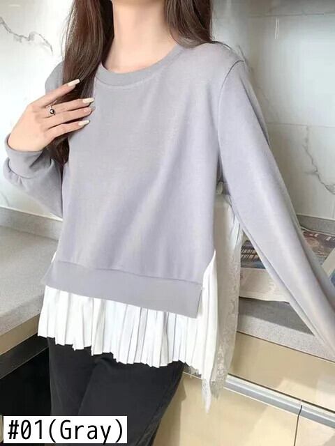 [EWQ] Oネック 長袖 パッチワーク ひだ フリル コントラストカラー プルオーバー スウェットシャツ レディース 秋 春 16U5851 ロング スプリング 春物 オータム 秋物
