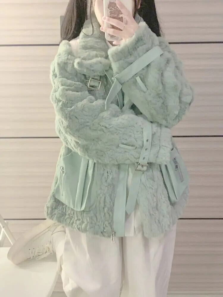 [EWQ] 大きポケットラペルジッパーラムウールフリースコートレディースグリーンぬいぐるみ厚手暖かいジャケットトップ秋冬 6731 オータム 秋物 ウィンター 冬物