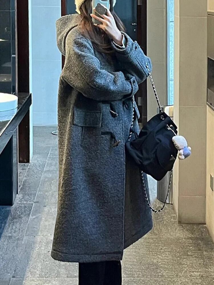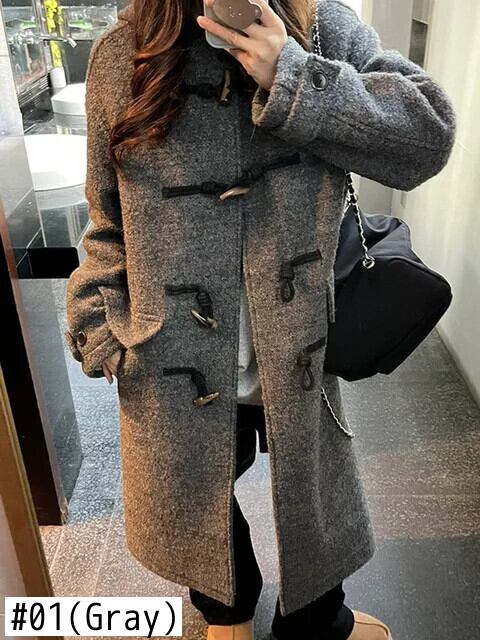 [EWQ] グレー 厚手 暖かい ウール コート レディース 長袖 カウホーンボタン フード付き アウター 秋冬 16U6732 ロング オータム 秋物 ウィンター 冬物