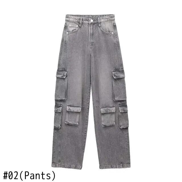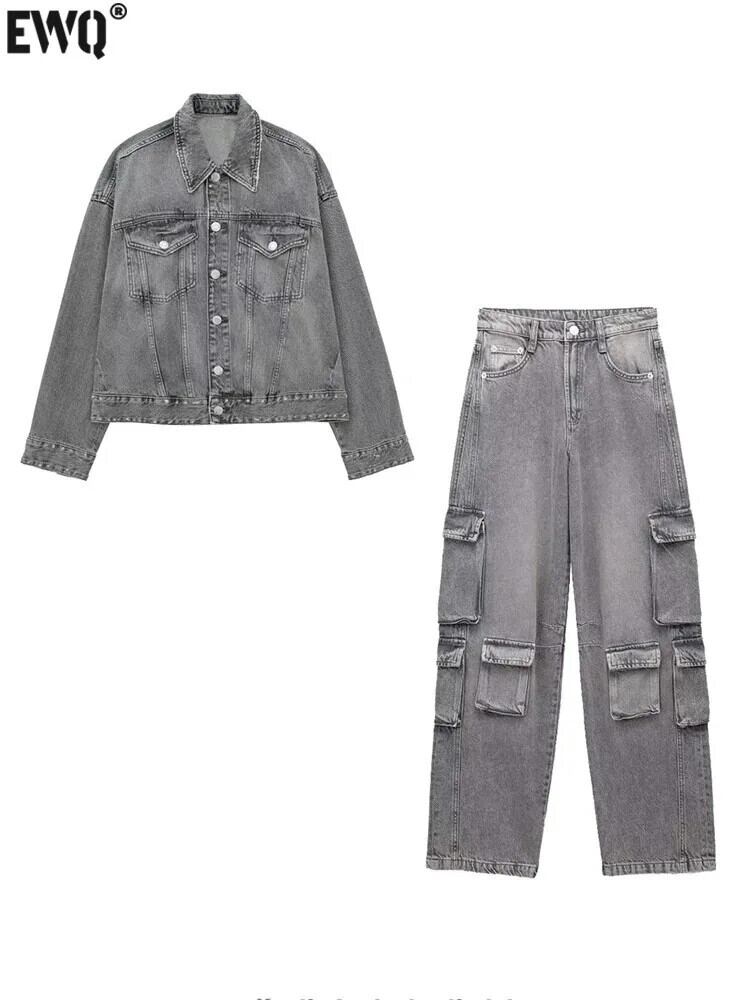 [EWQ] 長袖ライトブルーレディースデニムジャケットジャケット+ハイウエスト立体ポケットジーンズパンツ ハイウェスト ロング