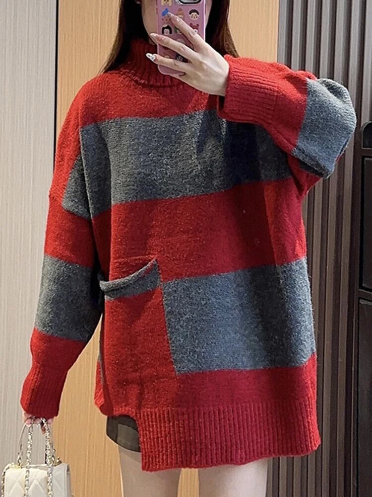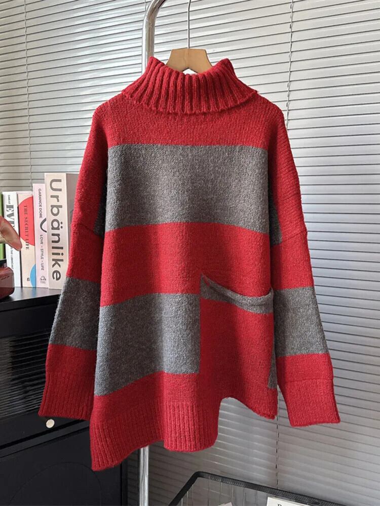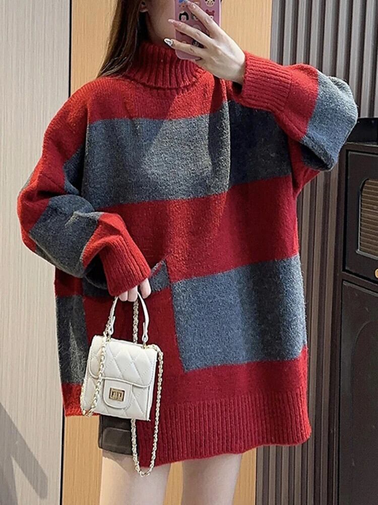 [EWQ] オーバーサイズ コントラストカラー ストライプ ニット タートルネック プルオーバー セーター 厚手 暖かい ジャンパー 秋冬 6U6470 オータム 秋物 ウィンター 冬物