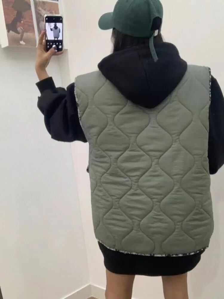 [EWQ] ひし形キルティング パッチワーク コントラスト カラー プリント シングルブレスト ノースリーブ ベスト ジャケット レディース ポケット ルーズ タンク 16U6589