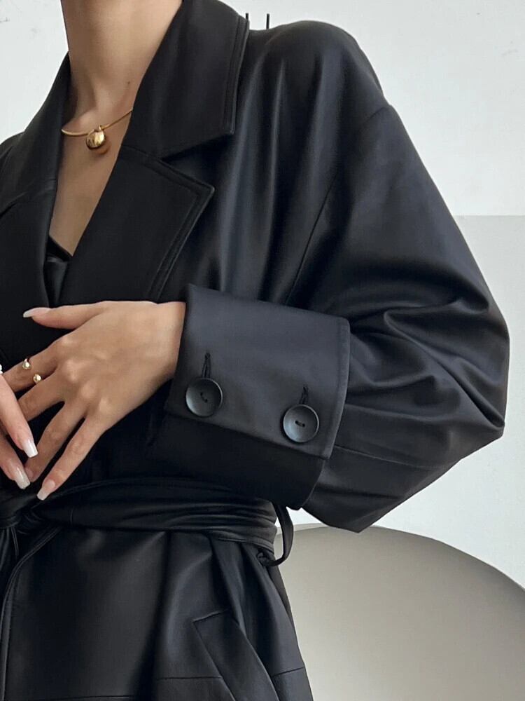 [EWQ] 黒長袖ルーズオートバイボンバーウエストベルト緩い Pu レザージャケットコート秋冬 16U622 ロング ブラック オータム 秋物 ウィンター 冬物 ハーネス