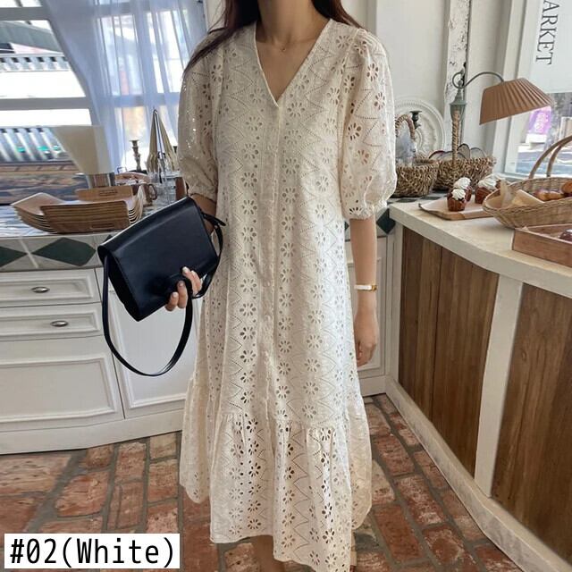 [EWQ] シックVネックレースかぎ針編みゆったりパフスリーブフリルワンピース Vestidos ホワイト U5630H ラッフル