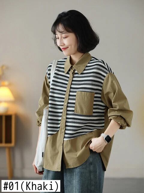 [EWQ] ラペルストライプニット継ぎ接ぎポケットシングルブレスト婦人シャツブラウス春秋6U6302 スプリング 春物 オータム 秋物