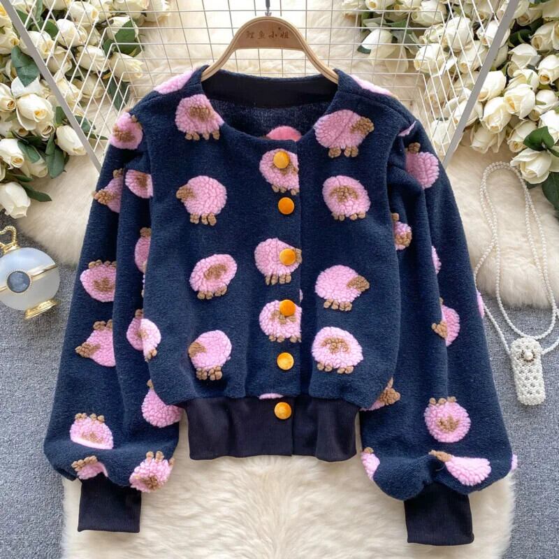 【EWQ】スイートフラワースリーブOネックジャケットプラッシュカーディガンショートウォームライトグレーコート秋冬アウター16R172 大人ガーリー スウィート キュート カジュアル オータム 秋物 ウィンター 冬物 フラワーデザイン