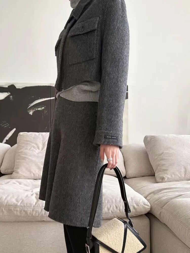 [EWQ]ラペルポケット長袖コートジャケットウエストワイドレッグハーフパンツズボン2点セットレディース秋冬U6338 ロング オータム 秋物 ウィンター 冬物 ワイドパンツ