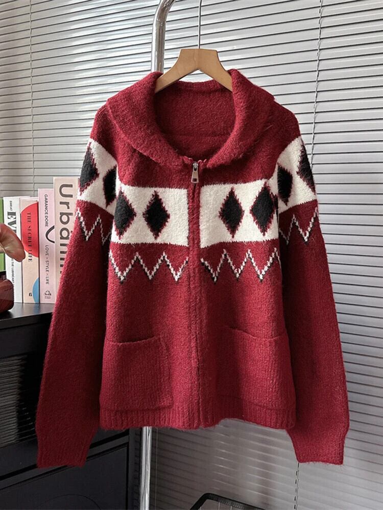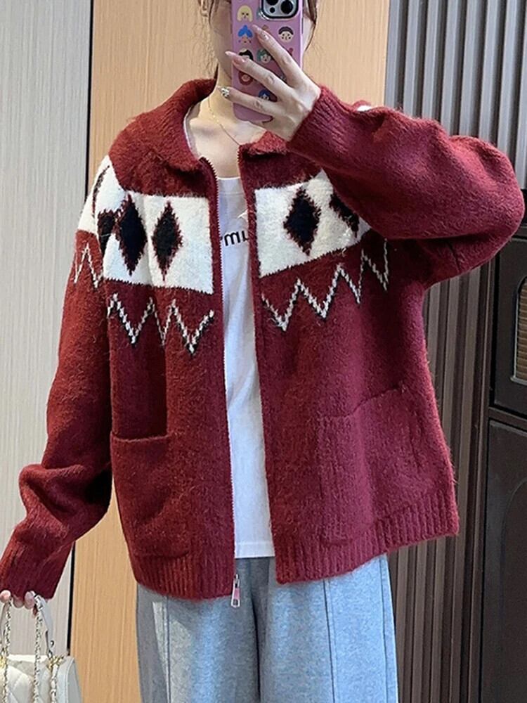 [EWQ] コントラストカラー ダイヤモンド チェック柄 ラペル ジッパー カーディガン ニット セーター ジャケット 婦人 秋冬 6U6468 オータム 秋物 ウィンター 冬物