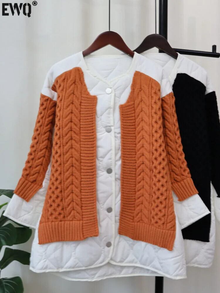 [EWQ] コットン コントラストカラー レディース ニット カーディガン ダイヤモンド チェック セーター コート ジャケット アウター 秋冬 16U5983 オータム 秋物 ウィンター 冬物