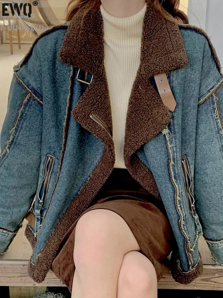 [EWQ]ラペルコントラストカラースプライスラムウールデニムブライトラインレザーファーコートジャケット秋冬U6511 オータム 秋物 ウィンター 冬物