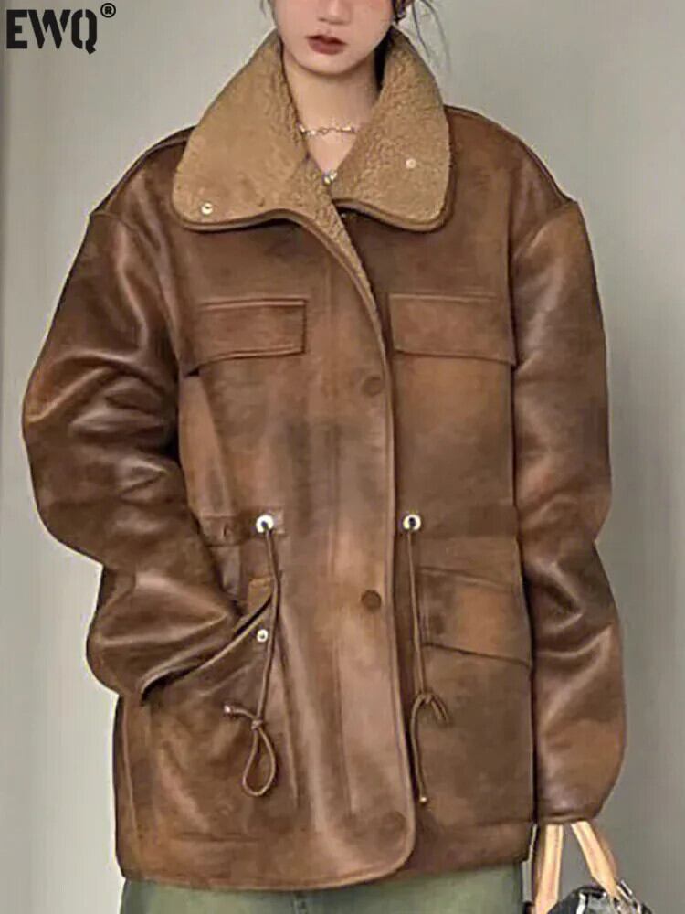 [EW] Q 両面着用厚いコートフェイクファービッグサイズオーバーコートストリートルーズブラウントップス秋冬 オータム 秋物 ウィンター 冬物
